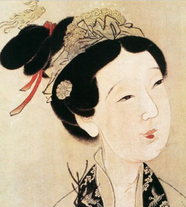 这种手法汲取了宋元妆的色彩风格,把隋唐“额间翠钿(diàn)、眉梢斜红、唇边笑靥(yè)”变成白色,有点类似于现在的高光,可以突出色差,使脸颊色彩偏亮,让五官更加立体。明代著名画家唐寅的作品,很好地展现了明代女子妆容的特点。