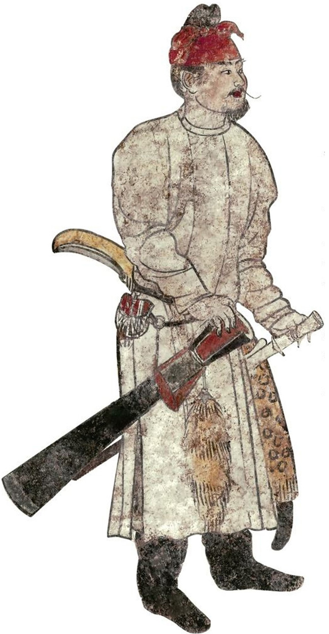 在唐代章怀太子李贤墓中的壁画上,身穿戎装的仪卫所佩戴的就是马蹄形鞶囊,红盖黑底,上面有白色竖条纹装饰,即为“银缕”。