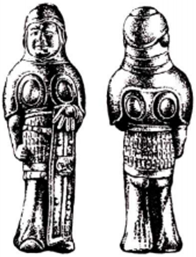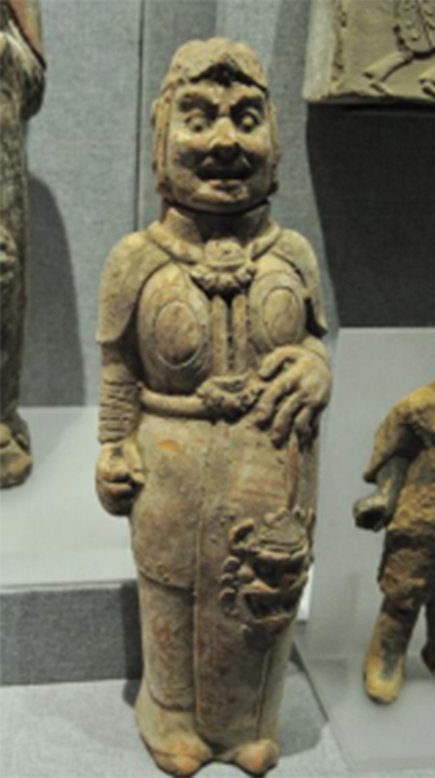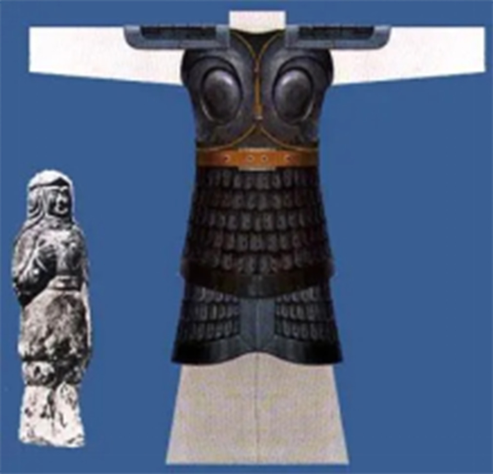 据研究发现,南北朝时期的明光铠延续了东汉末期到三国时期明光铠的名字,但样式却发生了明显的变化。其基本形制依然是用单个铁甲片串联起来组成铠甲,但在胸前和背后却各出现了两个椭圆形的大型金属甲片,犹如在胸前背后挂着几面镜子一般。